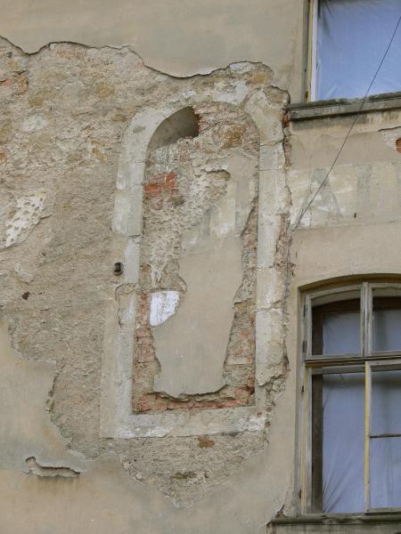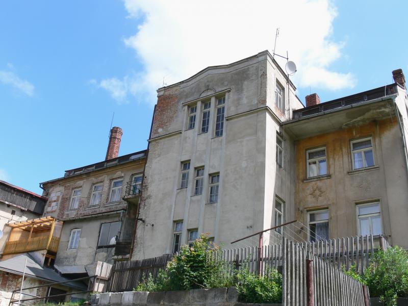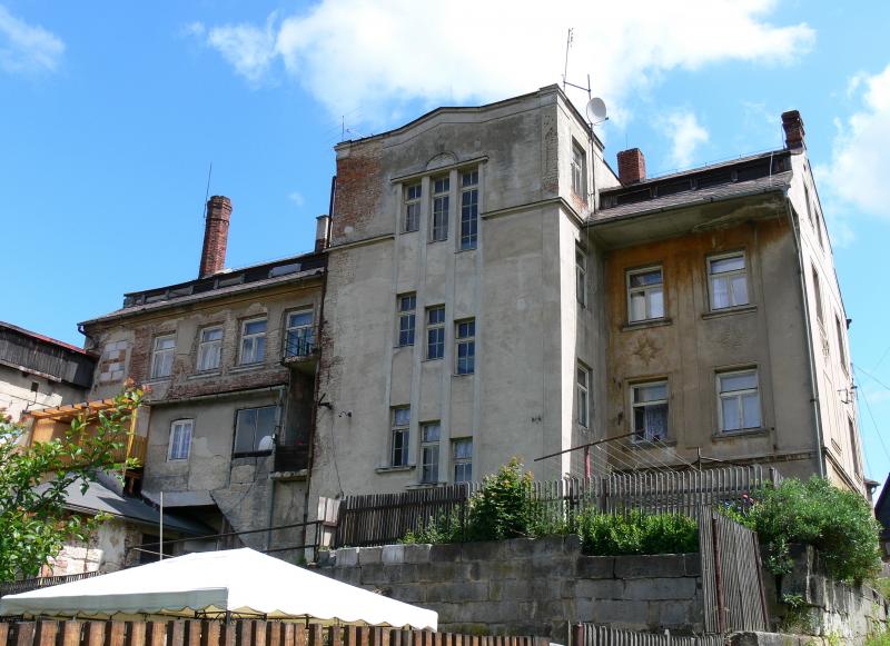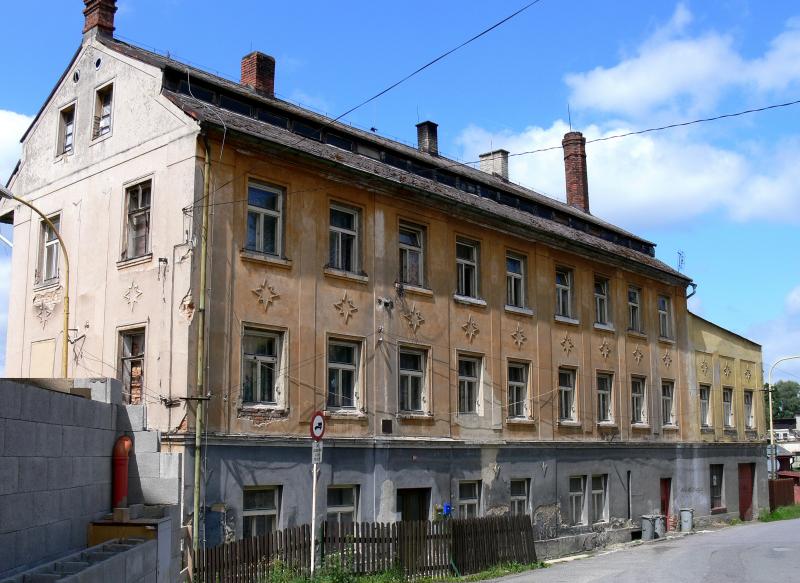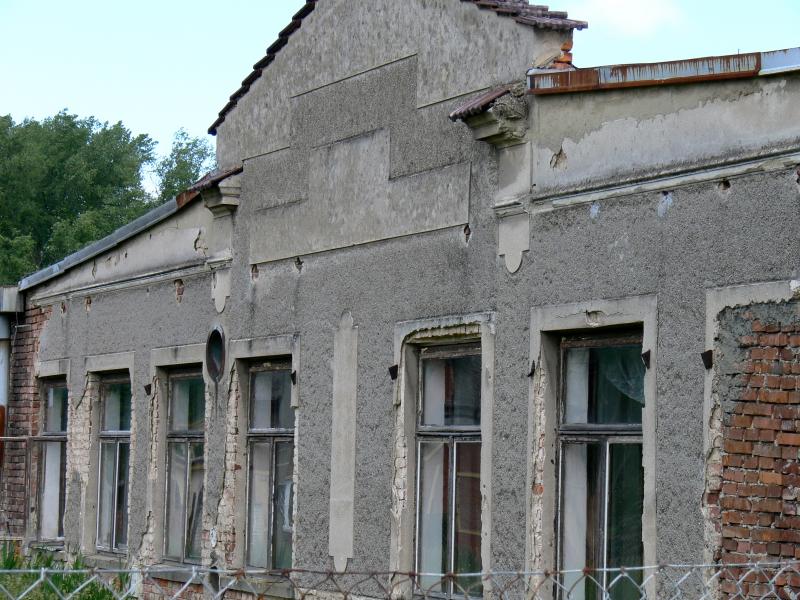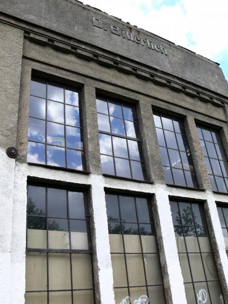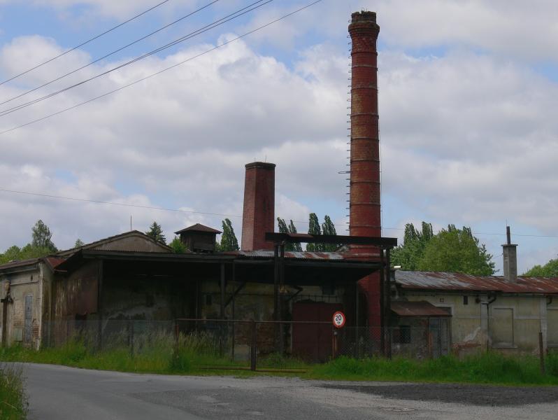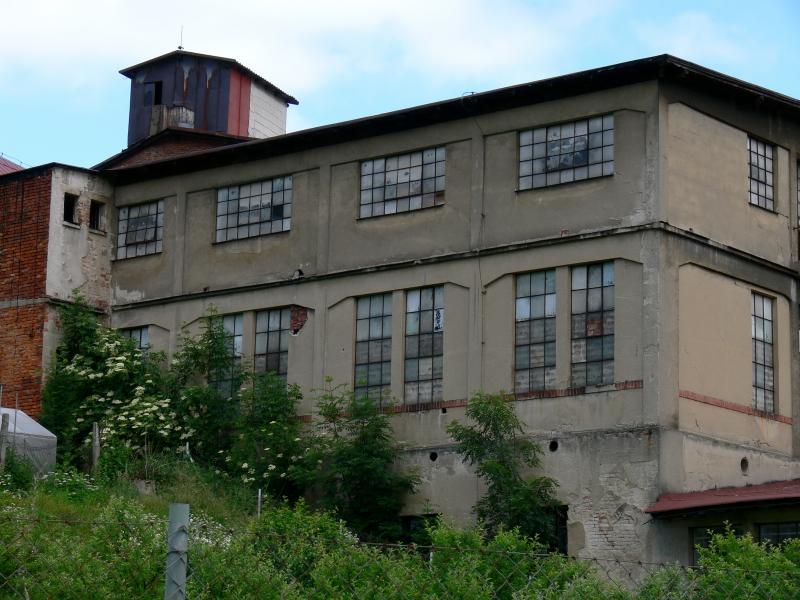 Má číslo popisné 36, snad to byla také továrna. Dva menší komíny se tady hrdě přidávají k těm ostatním ve městě. Čas se zde podepsal velmi silným písmem, rozbitá okna jsou někde zalepená, jinde ne. Ale co je hlavní, kolem je opět nepropustný plot. Dovnitř se podívám alespoň hledáčkem, kolem se vlní tráva a květy kopretin. Místní nás bedlivě sleduje, tak jdeme dál.