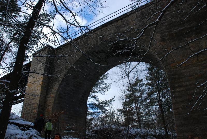 Jednoho sychravého zimního dne jsme se vydali na menší výlet. Neměli jsme v plánu nic náročného a proto jsme nasedli do auta, a jeli po staré silnici směrem do Zahrádek. Tam, v údolí Robečského potoka v podzámčí stojí starý mlýn Heinricha Schwarze, který nás zaujal. Budova má i přes svůj stav určité kouzlo. Jistě byla krásná a zajímavá, teď působí možná až strašidelně, jako pravý pohádkový čertovský mlýn. Dovnitř je vstup zakázán, a není se čemu divit. Znovu nasedáme do auta a necháme se svézt k vyhořelému zámku hned na kopci. Odtud máme v plánu krátkou cestu k viaduktům. Procházíme ještě zámeckou zahradou, a nevlídné počasí v nás jen prohloubí povzdech nad stavem zámku, který je sice zakonzervován, ale neobyvatelný. Vyrážíme starou alejí, podél zámku, dolů do údolí Robečského potoka a do osady Karba, odtud přes dřevěnou lávku k viaduktům. Ještě se podívame nahoru k trati, strávíme zde pár chvil i díky starým fotkám, co máme s sebou, a na nichž je zdokumentována stavba. Pak už jen cesta zpět k autům a zakončit krátký, ale zajímavý výlet v milé a prohřáté restauraci. Dáváme si něco k snědku a horký poctivý čaj a pomalu z nás vyprchává ten lehký smutek z krásných, ale opravdu zapomenutých staveb, které v tomto zimním počasí působí šedivě a nepřístupně.