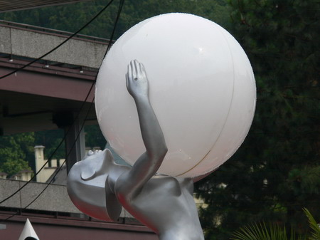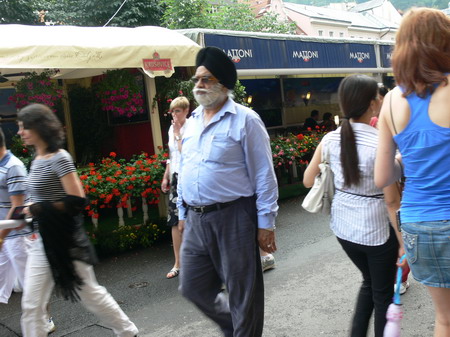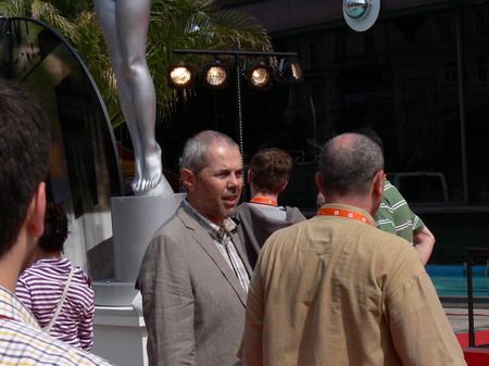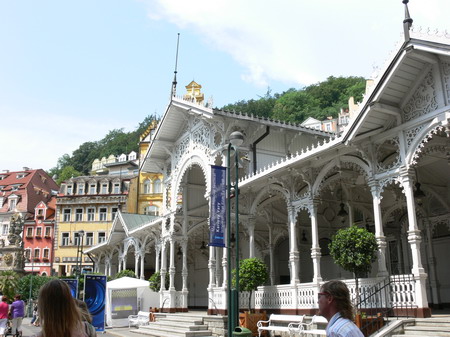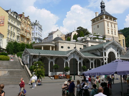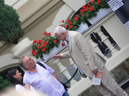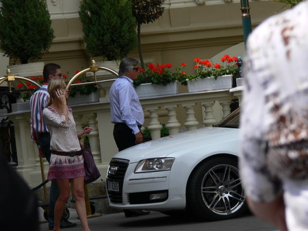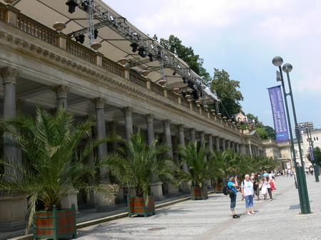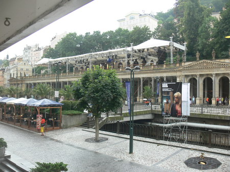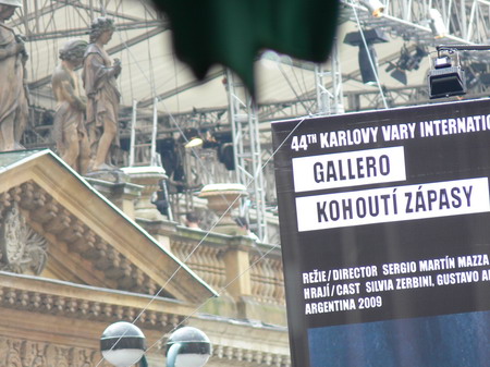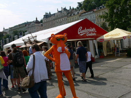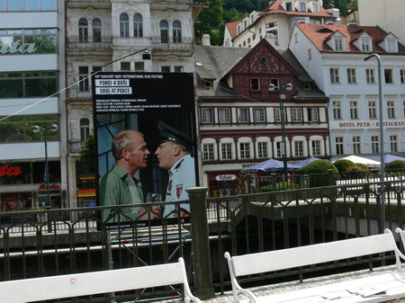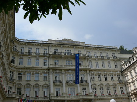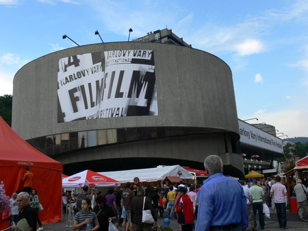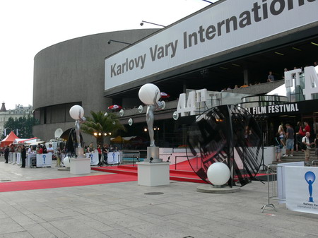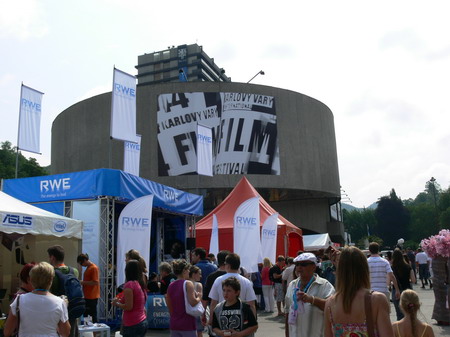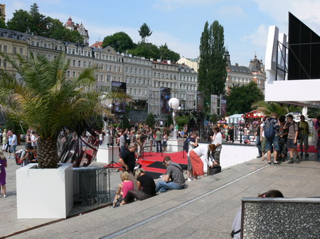 Po kafíčku za 99,- následuje kola za 80,- a po krátkém lijáku procházka k hotelu Pupp, kde bydlí ti nejslavnější hosté festivalu. Procházíme okolo prezidenta Klause a dopřáváme si chvilku v srdci toho největšího šrumce, pánové v černých oblecích neustále komunikující vysílačkou, luxusně odění důchodci, studenti s baťůžkama, Arabové, indiáni, Rusové, Angličani, prostě koktejl, který se dá vychutnávat dlouhé hodiny.