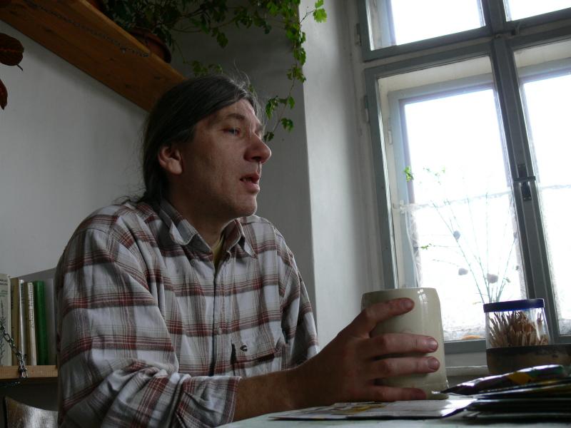 Já jsem tady potkával lidi, o kterých jsem věděl, že něco dělají, že jsou určitým způsobem tvůrčí. Nikdo o nich nevěděl a oni o sobě nevěděli navzájem. Snažím se být otevřený hodně různým lidem... Rozhodl jsem se udělat letáčky, oblepil jsem celý okres a tak se lidi spojili. Šlo hlavně o to, že když někdo maluje, tak sám sobě výstavu neudělá. Jednak se cítí trapně, nemá prostředky, neumí to. Stejně tak muzikanti. Muzikant může vymýšlet muziku, ale sám sobě manažerem, to moc nejde…to je zoufalý. Podobné je to s literáty, i když literáti jsou nejautonomnější. Jen třeba nemají moc myšlenky na vydávání. Spolek má nahrazovat ty manažery. Je tu možnost dělat výstavy, vydávat tiskoviny a podobně.