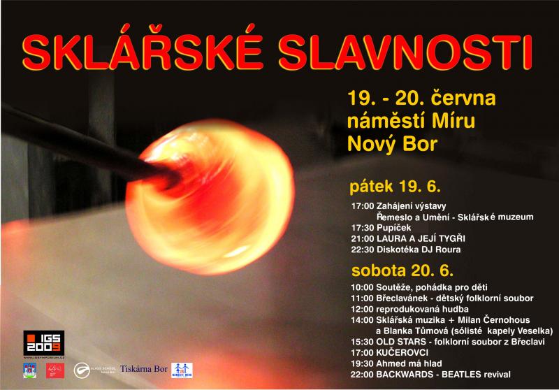 Novoborská sklářská škola připravuje dílny, ve kterých budou vznikat nejen skleněné vitráže, ale i malba na skle či broušení. Velkým lákadlem jsou sobotní sklářské trhy, kterých se letos zúčastní nejen sklářské firmy ale i uměleckoprůmyslové školy z Kamenického Šenova a Turnova. Ve Sklářském muzeu bude v pátek od 17:00 zahájena výstava soutěžních prací 6. ročníku Řemeslo a Umění ve skle. Poté už bude celý večer na náměstí Míru patřit hudbě. Vystoupí skupina Pupíček, pražská kapela Laura a její tygři a DJ Roura se svými Oldies hity.