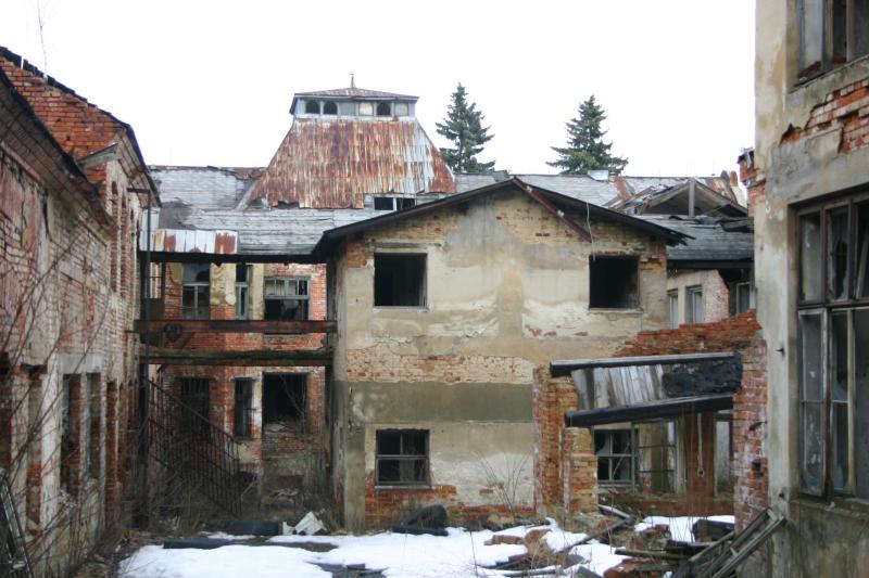Pomalu se probojovávám do átria celého objektu a cestou zakopávám o lecjaké poklady. Petlahve, sáčky od kdečeho, trámy, ale také střepy z lustrů, jež tu ve vší slávě leží opomenuté časem i lidmi. I pouhé střepy jsou stále krásné. Těch je tu ostatně víc než dost. Vydávám se na zadní nádvoří, kde narážím na další tragicky vyhlížející budovy zdejšího areálu. Celý prostor jakoby žil svým vlastním životem. Všude slyším kapky vody, pomalé chrastění omítky a pukání dřeva; stěny jakoby šeptaly příběhy někdejší slávy, dnes již dávno zapomenuté. Vše působí až morbidně, člověku z toho až začne naskakovat husí kůže, hlavně když mezi neustálým klapáním a rachtáním postřehne pomalu se blížící kroky. Pomalu mi celý objekt začíná připomínat domy z amerických hororů, jako bych neměla právo tudy procházet a vyrušovat mír dávno zašlých dní.